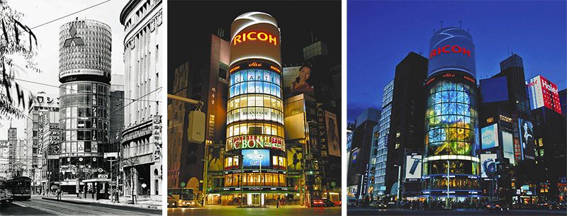 昭和21年銀座4丁目交差点に地上2階「三愛ビル」建設。昭和38年に円筒型「三愛ドリームセンター」建設。