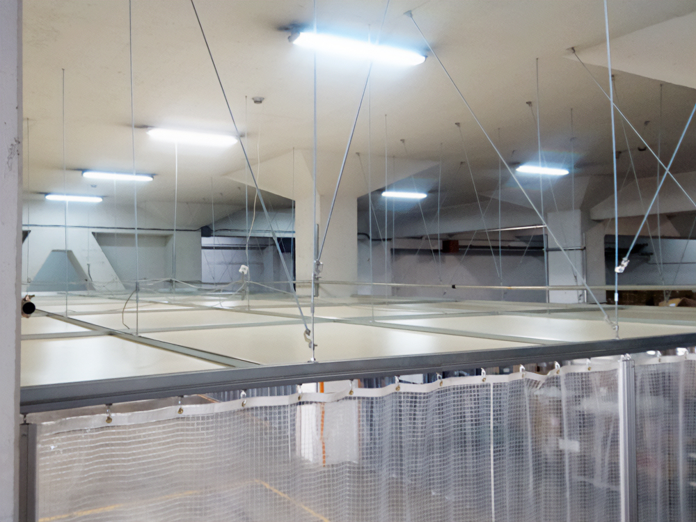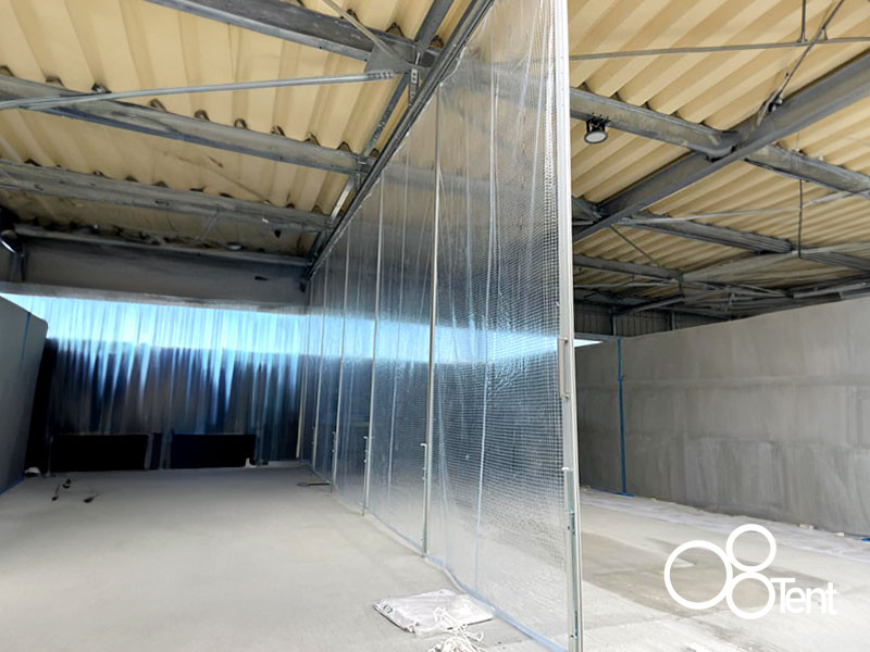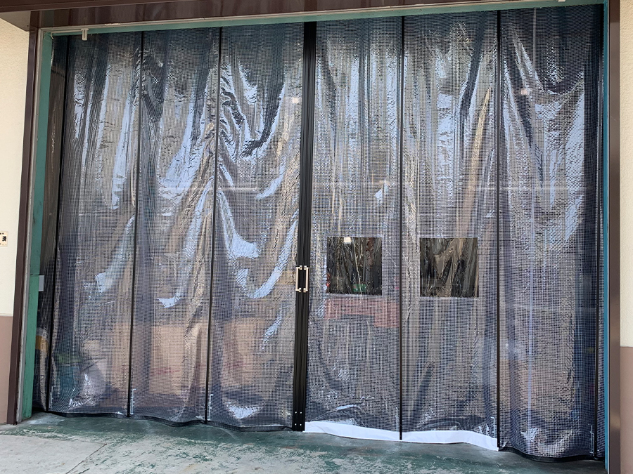 製鉄所の処分場間仕切りカーテン透明糸入りビニールカーテン丸八テント商会。