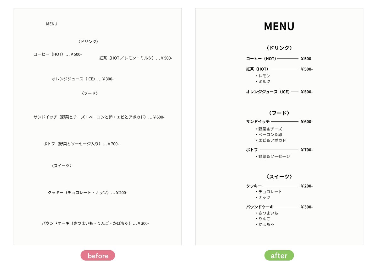 デザインの四大原則」で、文字だけでも見やすいメニュー表を作ってみよう!きらきら工房デザイン事務所。