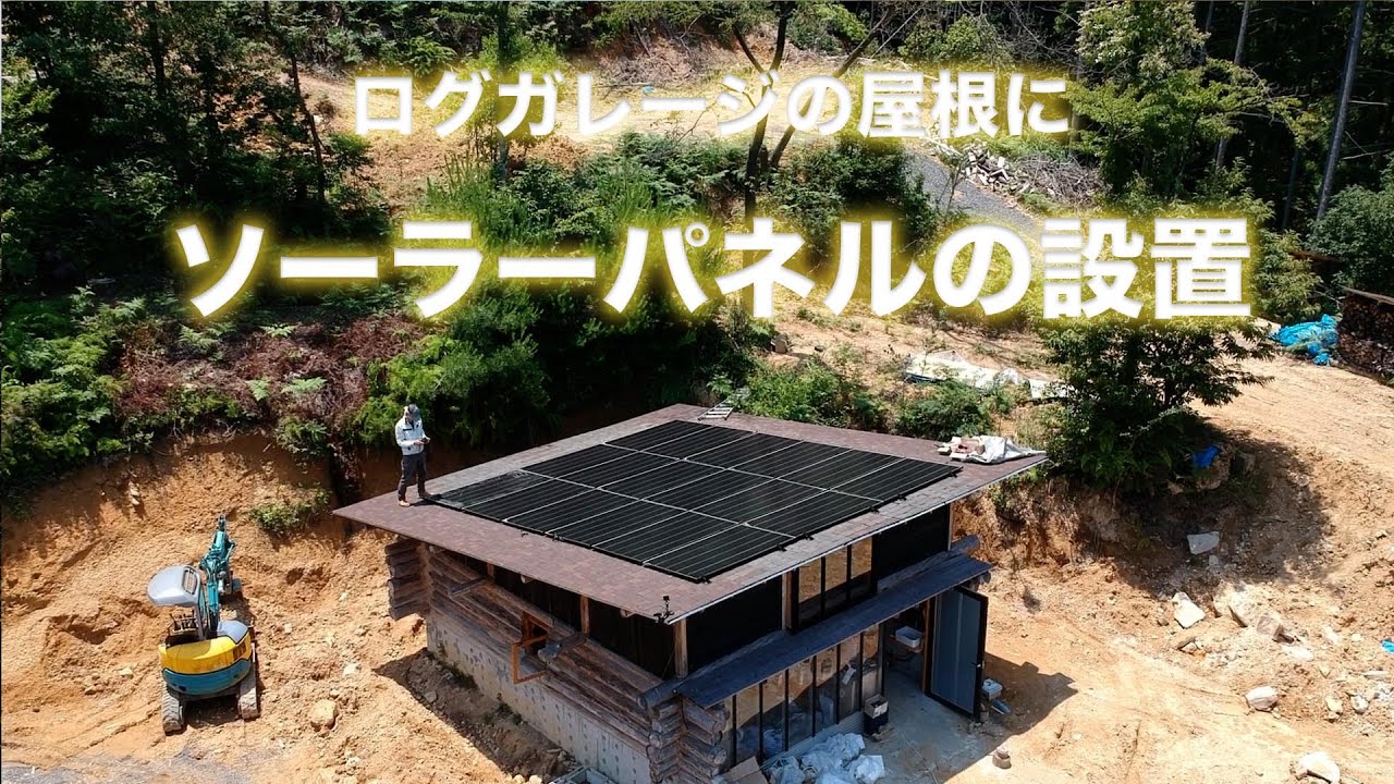 ログガレージの屋根の上に、ソーラーパネルを設置した。