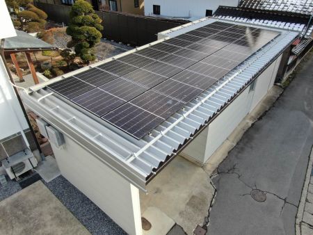彦根市 88ルーフガレージに太陽光パネル施工高畑産業株式会社。