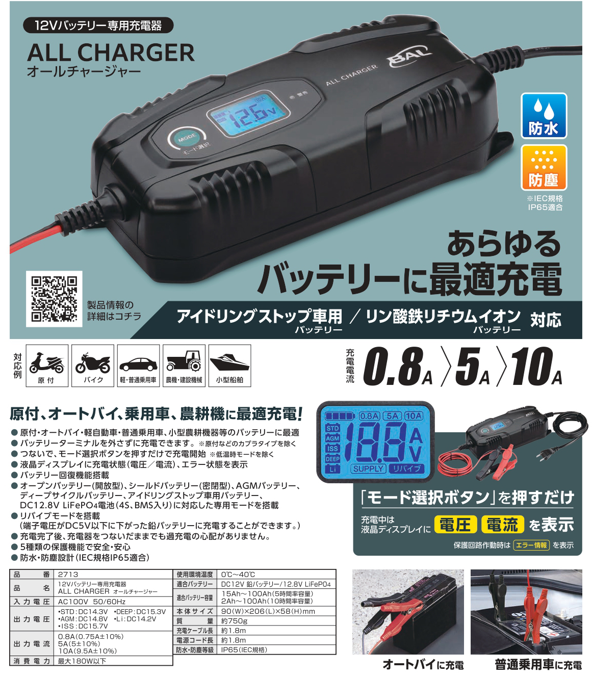 大橋産業 BAL 2713 バッテリー充電器 アイドリングストップ車 DC12V専用 鉛バッテリー 防水 防塵 IEC規格 IP65 :クレールオンラインショップ - 通販 - Yahoo!ショッピング。