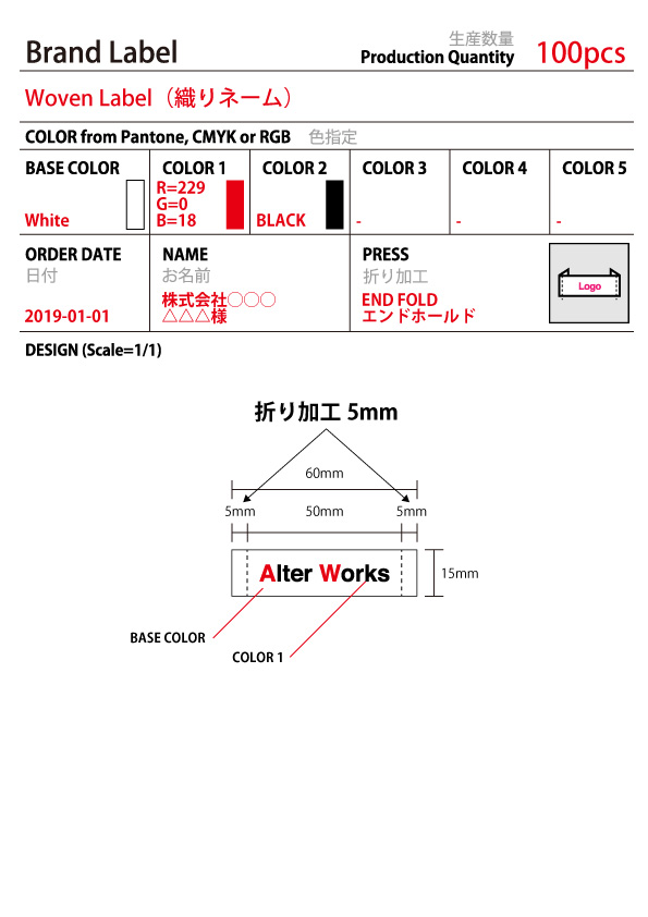 オリジナル ブランドネーム 100枚わずか9900円で作成できる秘密ブランドタグ 付け替え ネーム生産 オルターワークス Alter Works。