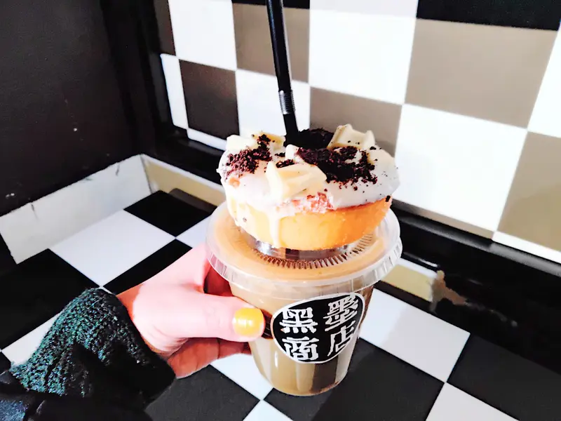 九州で大人気のドーナツ屋『黒墨商店』が八王子で関東1号店をオープン👏🎉熊本や福岡など九州で大バズり中!『真夜中に食べるドーナツ屋』がコンセプトの背徳のお味のドーナツ😇深夜に甘いものが食べたーいという欲望を満たしてくれます🌙 飲み物と一緒にドーナツを注文。