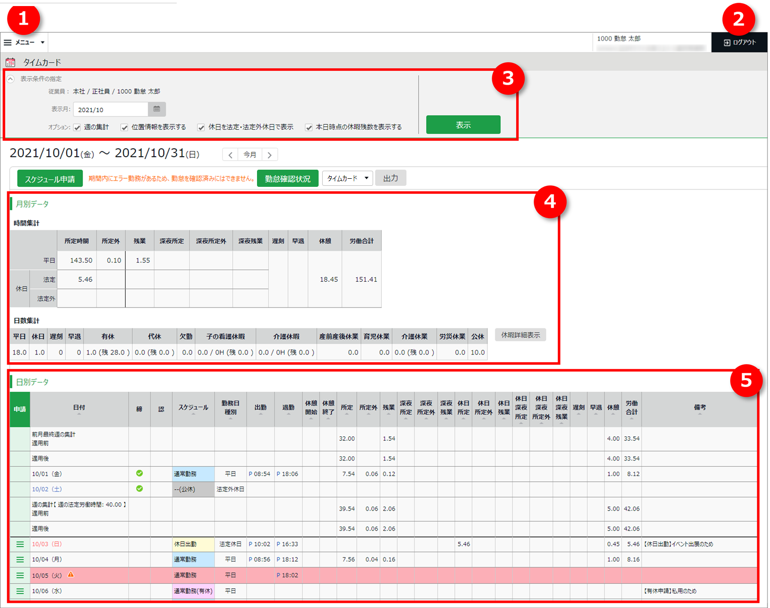 勤務データの確認 ~タイムカード画面~タッチオンタイム オンライン・ヘルプ。
