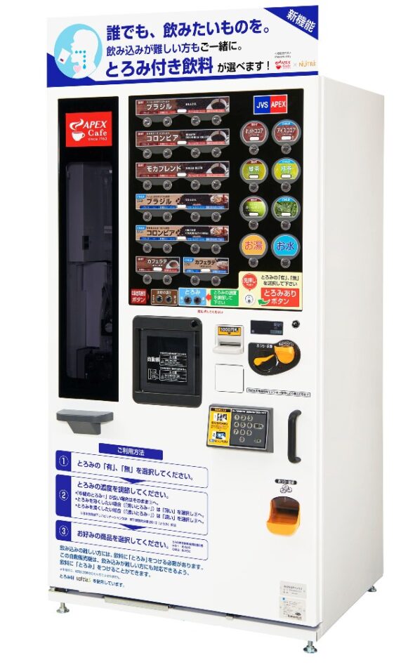 日本初※の新機能“とろみボタン”付き 「カップ式自動販売機」を共同開発 人材不足の医療・介護現場に新しいリソースを提供株式会社アペックス、ニュートリー株式会社。