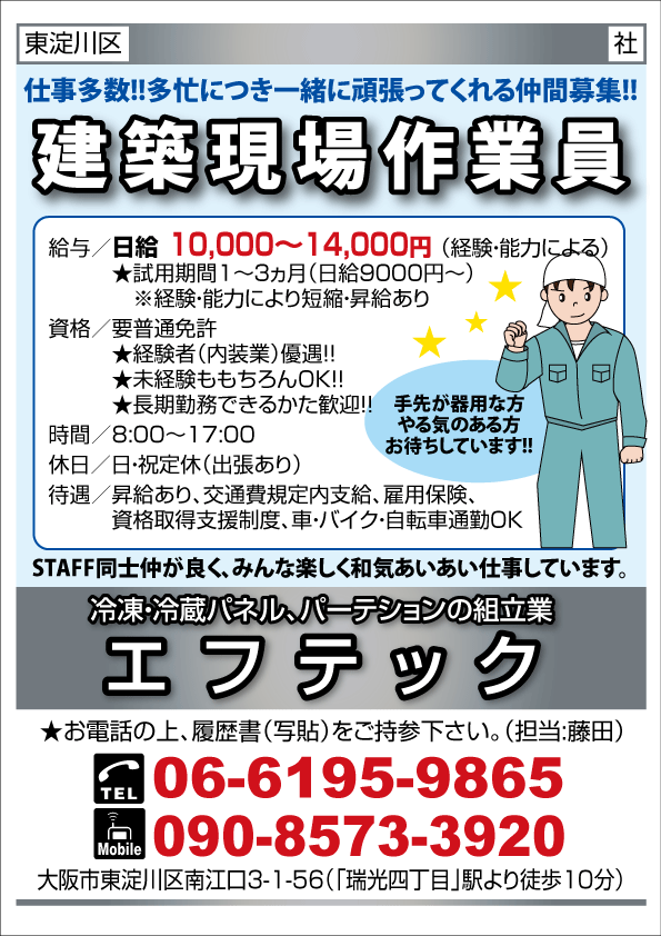 東淀川区 建築現場作業員募集 冷凍・冷蔵パネル、パーテションの組立業 エフテック求人プラザ大阪の求人ブログ。