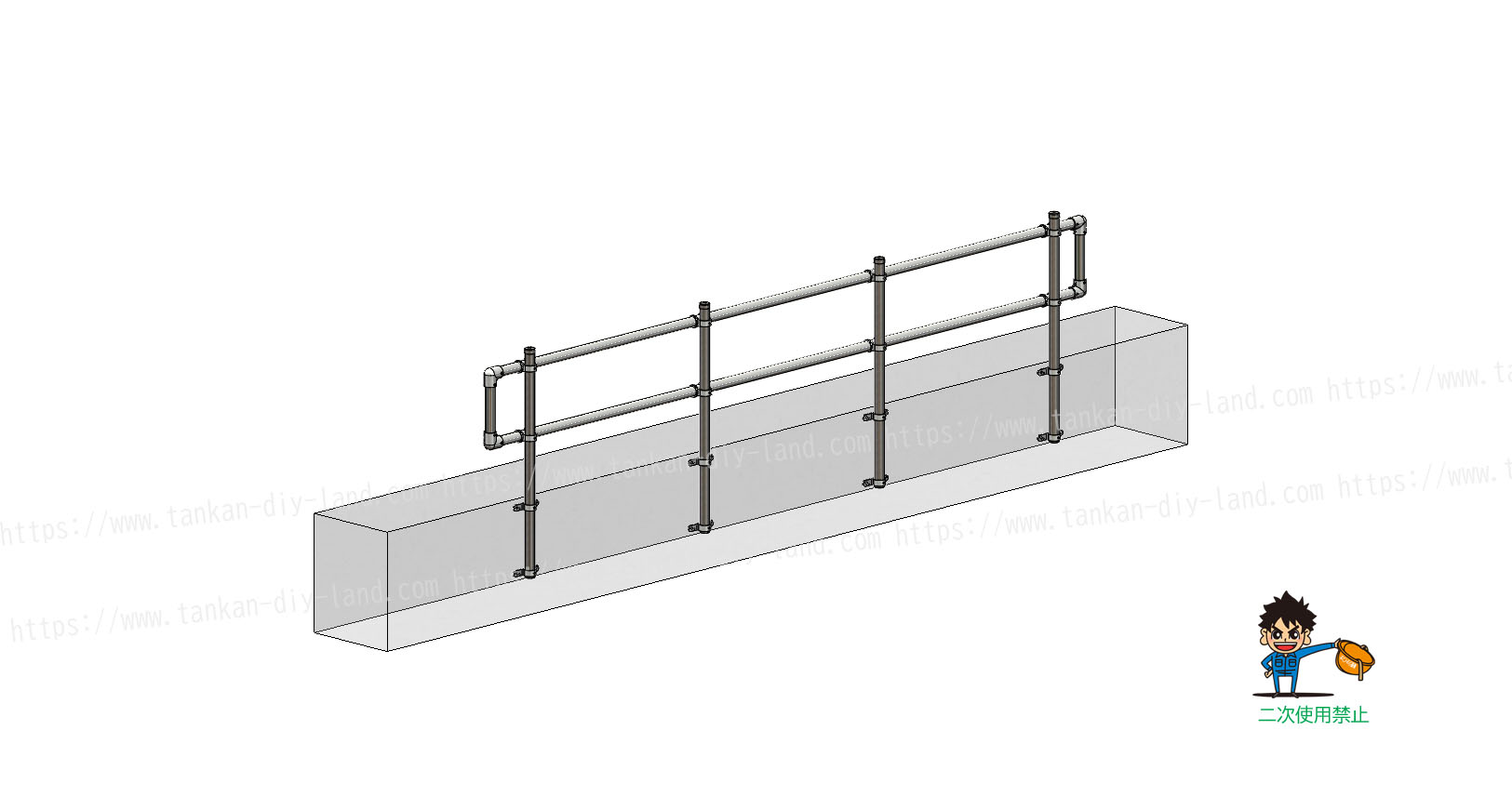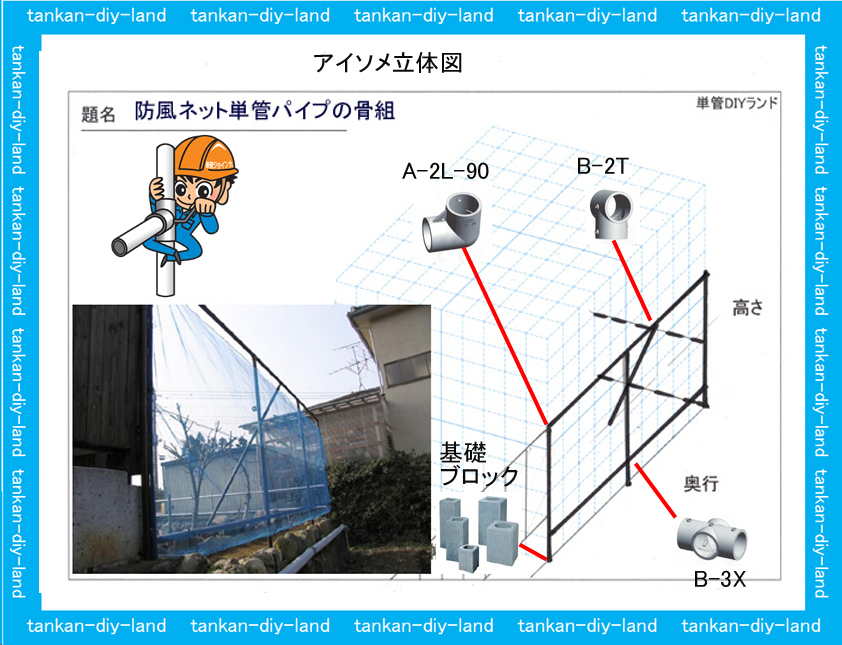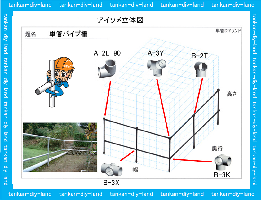 単管パイプ 『柵・フェンス・手摺・塀』 アイソメ立体図で使用金具の解説単管パイプのDIYや組み方の学習なら単管DIYランド。