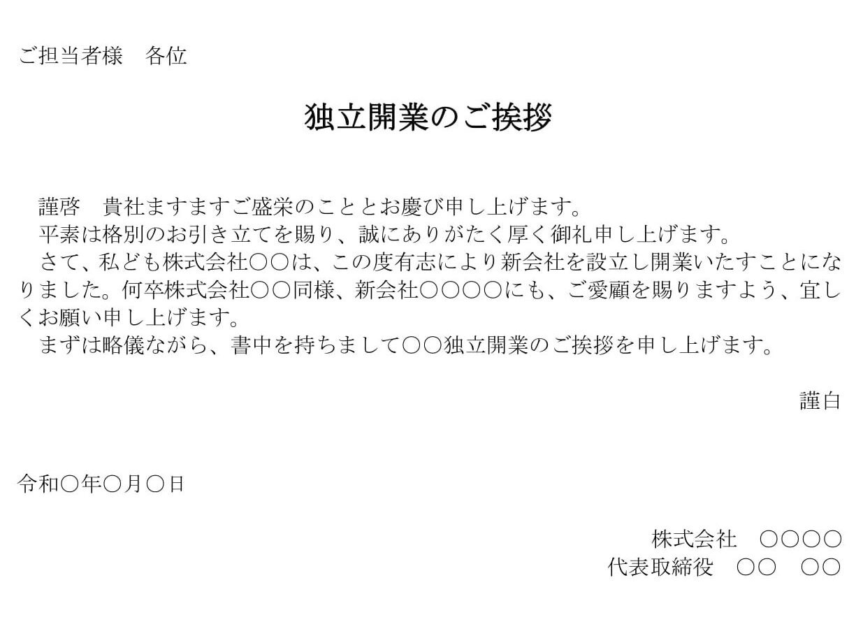 独立開業の挨拶状の文例テンプレート Word・ワード使いやすい無料の書式雛形テンプレート。