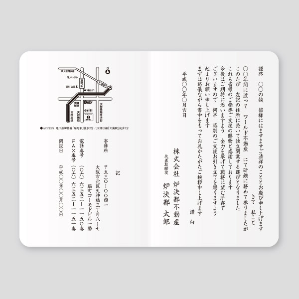 挨拶状印刷 二つ折カード+封筒最小10枚から 個人 法人 転勤 退職 退社 定年 転職 転居 海外赴任 引越 結婚 同窓会独立開業 竣工 落成 移転 総会 社長 交代 役員 改正 挨拶 例文 楽天市場9 30まで○全品ポイント5倍! エントリー要挨拶状。
