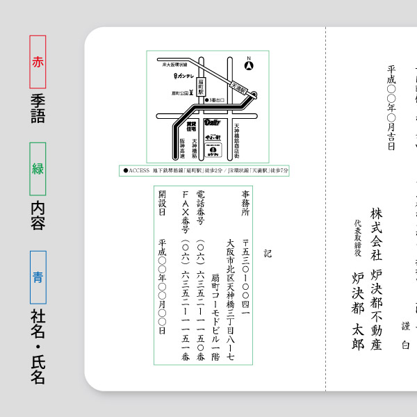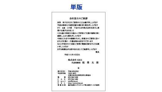 会社設立・独立開業 挨拶状大部数印刷短納期封入封緘投函宛名印刷自由文。