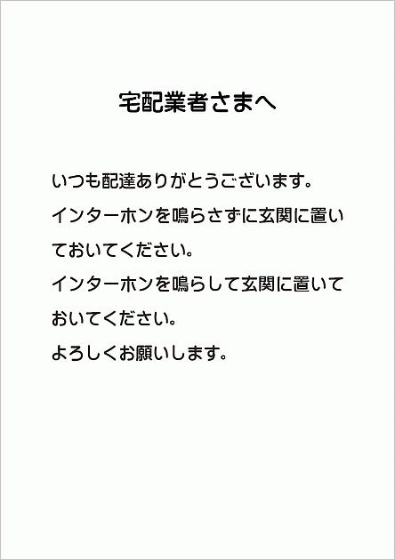 宅配の張り紙:個人向けの例文のテンプレートを無料ダウンロード - 登録不要のフリーテンプレート。