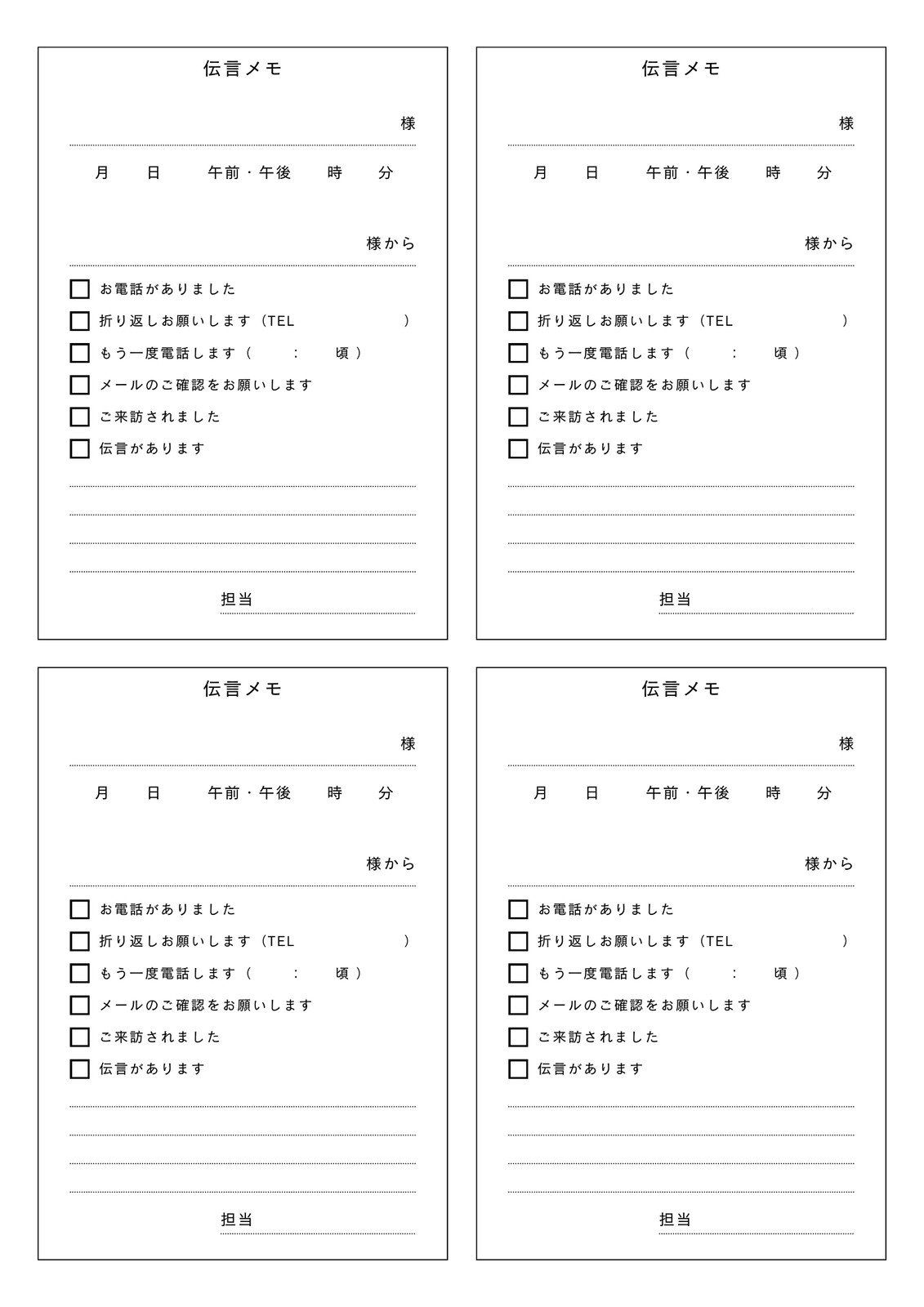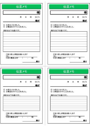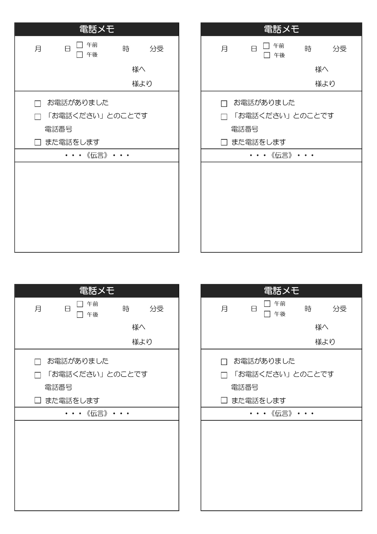 学校やビジネスで使えるシンプルなA4で印刷できる電話メモ、4分割のエクセル・ワード・PDFのテンプレート!:イラスト無料。
