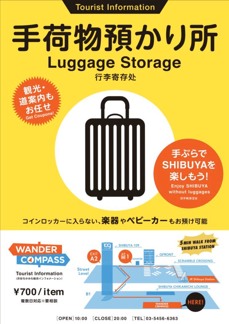 公式 東急電鉄@のるるんと一緒 on X: "渋谷駅周辺で 荷物をお預け予定のお客さまは、東急田園都市線渋谷駅地下1Fにある「ワンダーコンパスSHIBUYA」をご利用ください。※営業時間は10時〜20時、年末年始も営業予定です。 #荷物 #ロッカー #渋谷 #観光 #baggage。