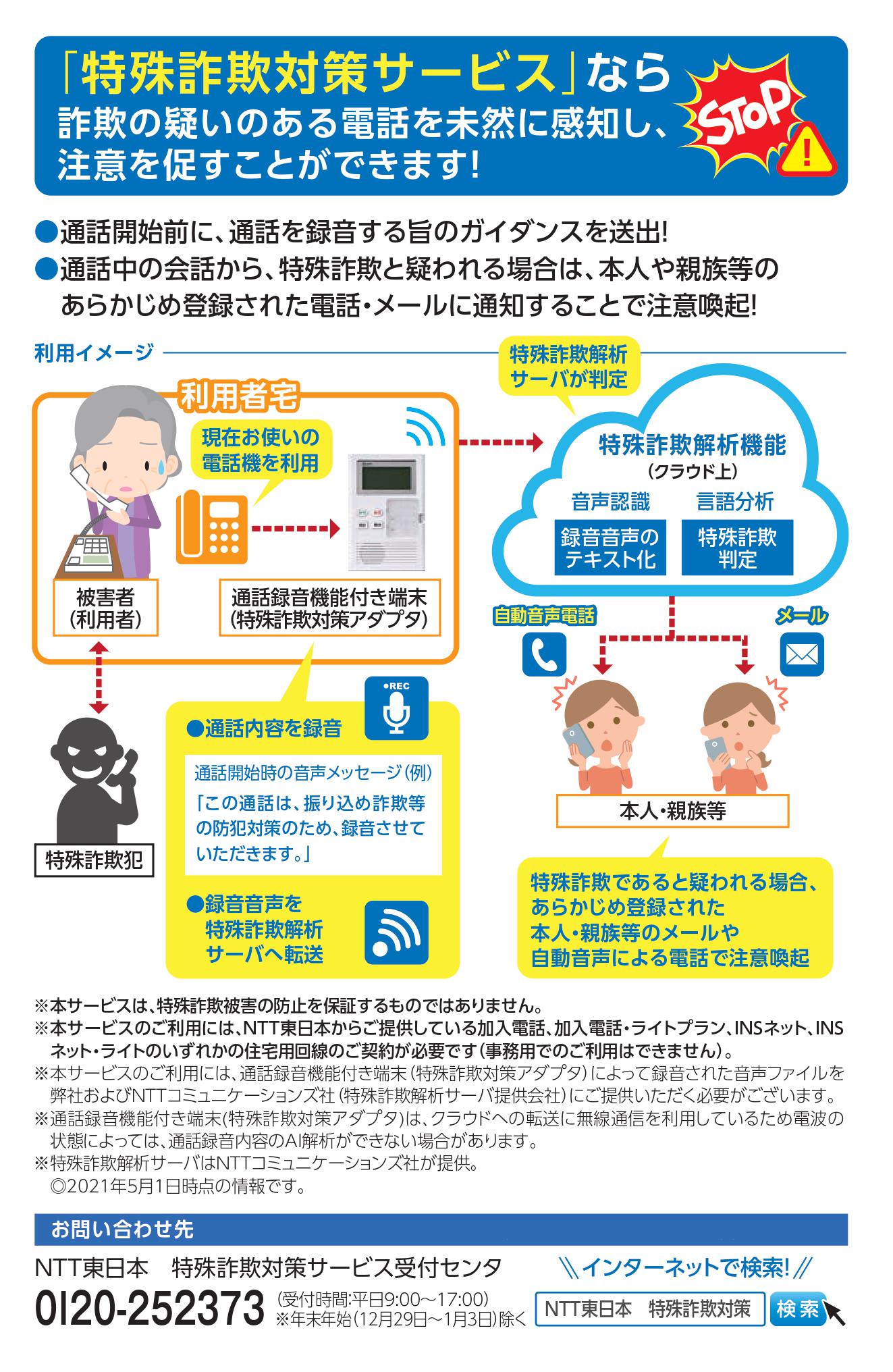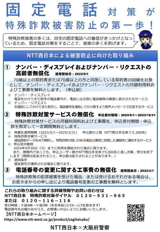 山口県理容生活衛生同業組合 -お知らせNTT西日本が、うそ電話詐欺対策に極めて有効な「特殊詐欺対策サービス」の無料申込受付を延長しました。 固定 電話この取組は被害防止に極めて有効です。是非利用しましょう。Facebook。