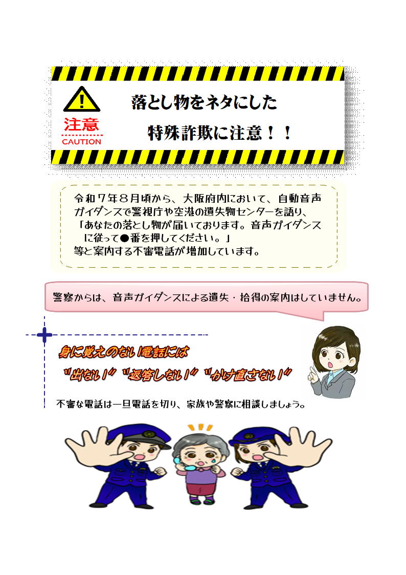 会計課 落とし物をネタにした自動音声電話に注意! 大阪府警本部。
