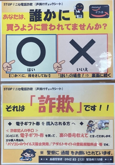 鳥栖署が独自に作成し、店に配布している偽電話詐欺防止の声掛けチェックシート。A4判の表裏に注意喚起の言葉が並ぶ - ネパール人コンビニ店員、偽電話詐欺防ぐ佐賀・鳥栖署の「声掛けシート」活用 - 写真・画像 2 2西日本新聞me。