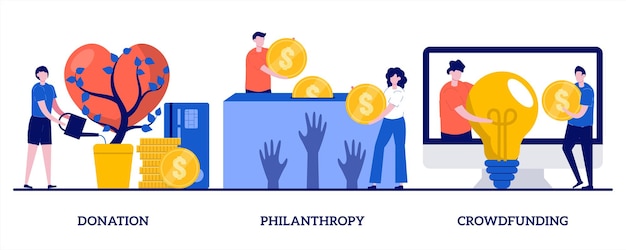 寄付、慈善活動、小さな人々とのクラウドファンディングのイラストPremiumベクトル素材。