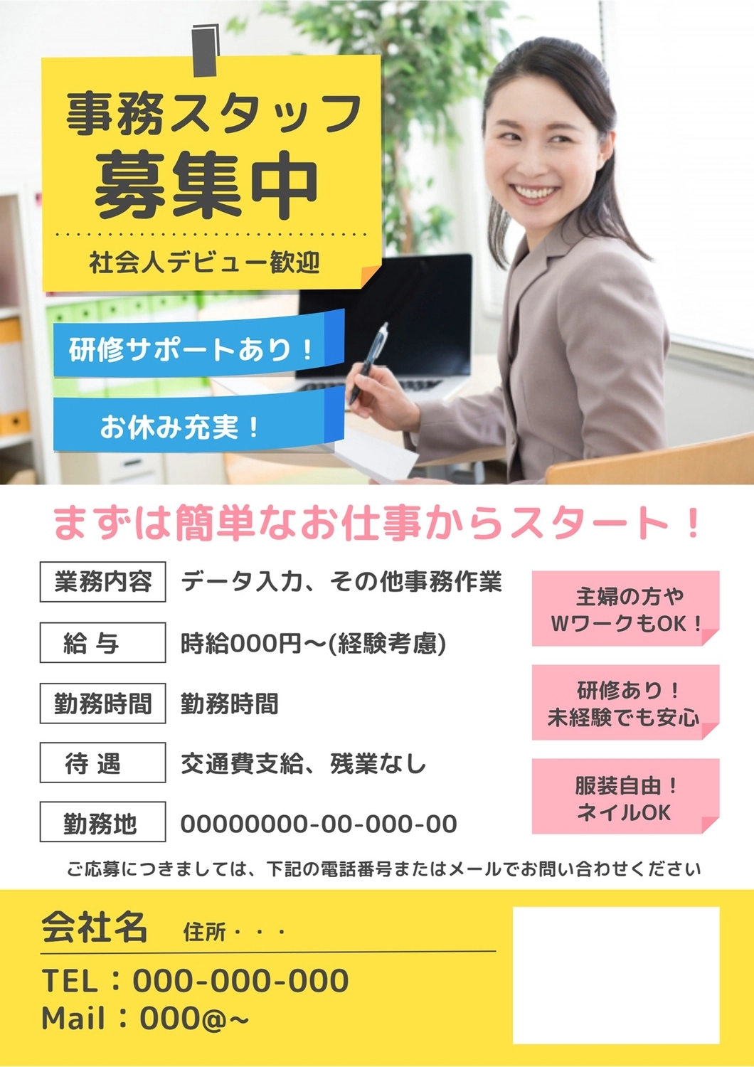 事務スタッフ募集チラシの無料チラシテンプレート 554 - デザインAC。