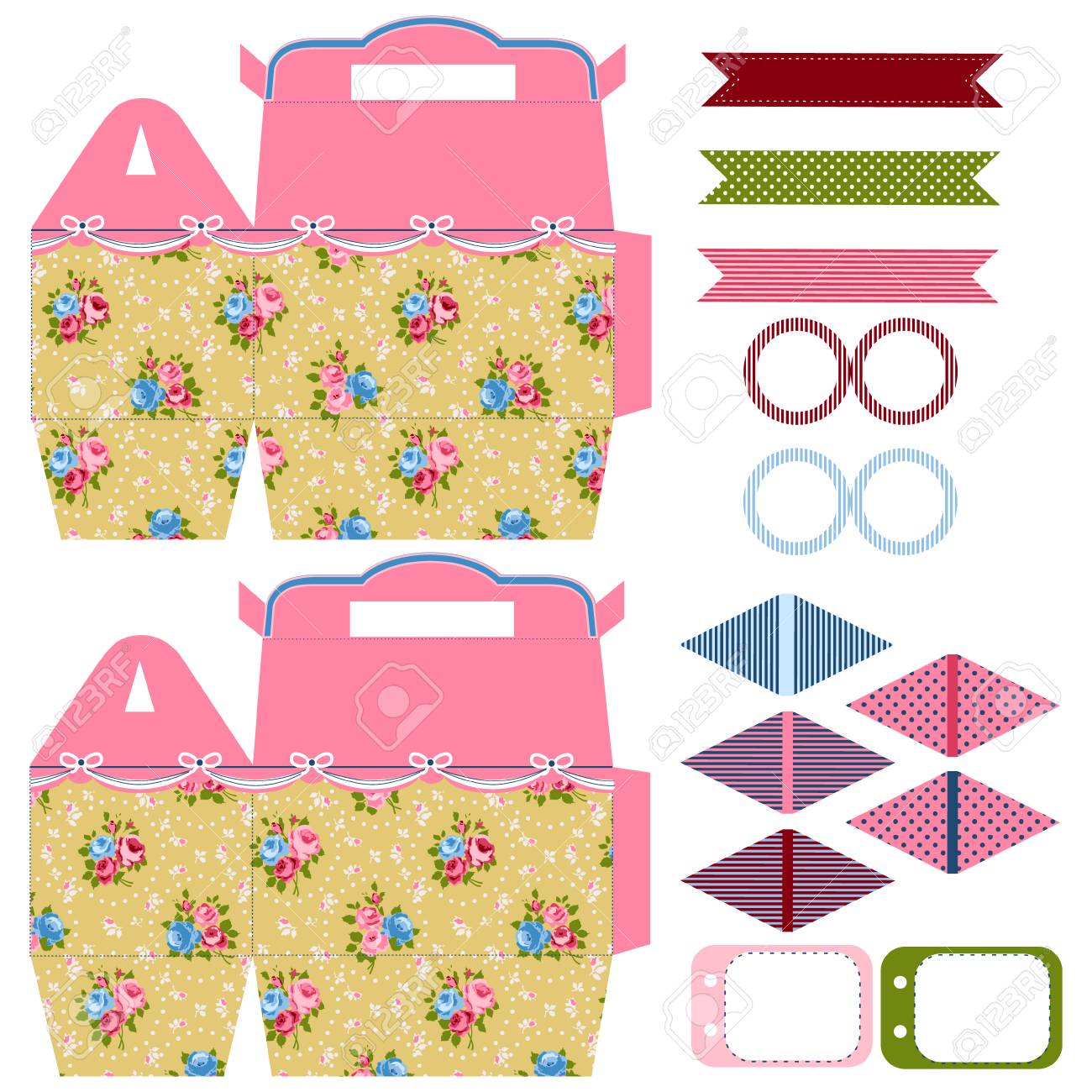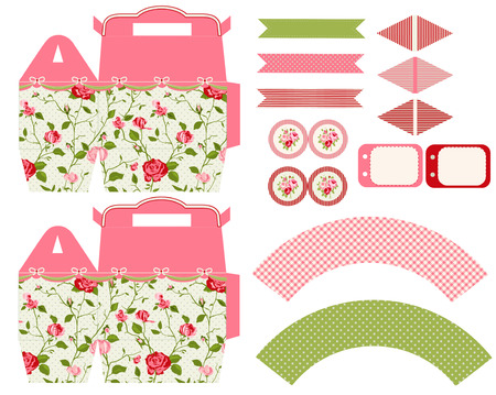 パーティー セット。ギフト ボックス テンプレート。抽象的なみすぼらしいシックな花柄、古典的なカントリーローズ。空のラベルおよびカップケーキのトッパーと食品タグ。のイラスト素材・ベクター Image 29174274。