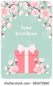 ピンクのギフトボックスと縦型テンプレート、桜、春の花。レトロなベクターイラスト。ボケ背景。テキスト用の場所。招待,バナー,カード,ポスター,チラシ, ギフト券」のベクター画像素材 ロイヤリティフリー585675860Shutterstock。