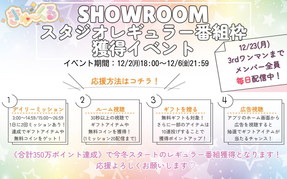 花城奈央きゅ〜くるon X: "「SHOWROOMスタジオレギュラー番組枠獲得イベント」 この後18:00~スタートです❣️12 6までの5日間で全員合わせて "350万ポイント"⭐️ 是非応援宜しくお願いします🙏🏻毎日配信で1~3位の方には手書きメッセージ画像をプレゼント。