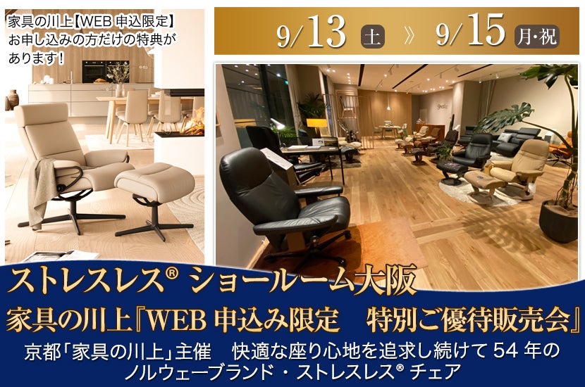ストレスレス🄬チェア大阪ショールーム 家具の川上『WEB申込み限定特別ご優待販売会』大阪府のアウトレット家具 インテリア のセール・イベント情報ならSeiloo。