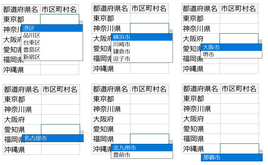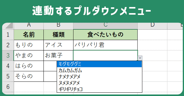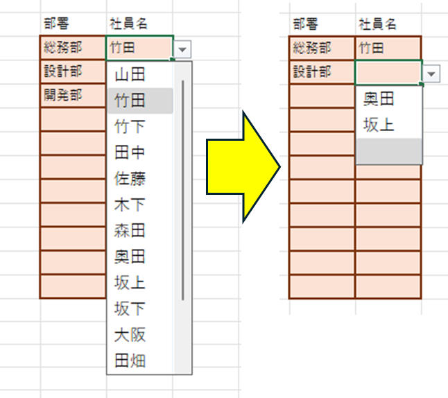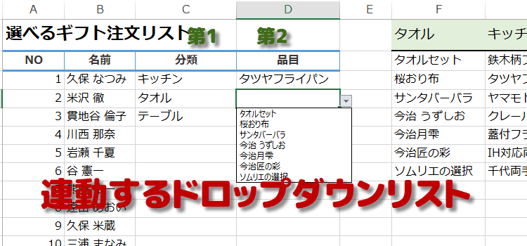 前の選択で次の選択肢が変わる連動ドロップダウンリスト Excel・エクセル。