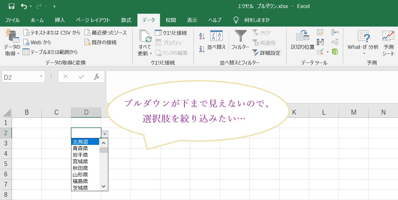 エクセルのドロップダウンリストが見にくい、プルダウンの絞り込みをする方法は?Curlpingの学びblog。