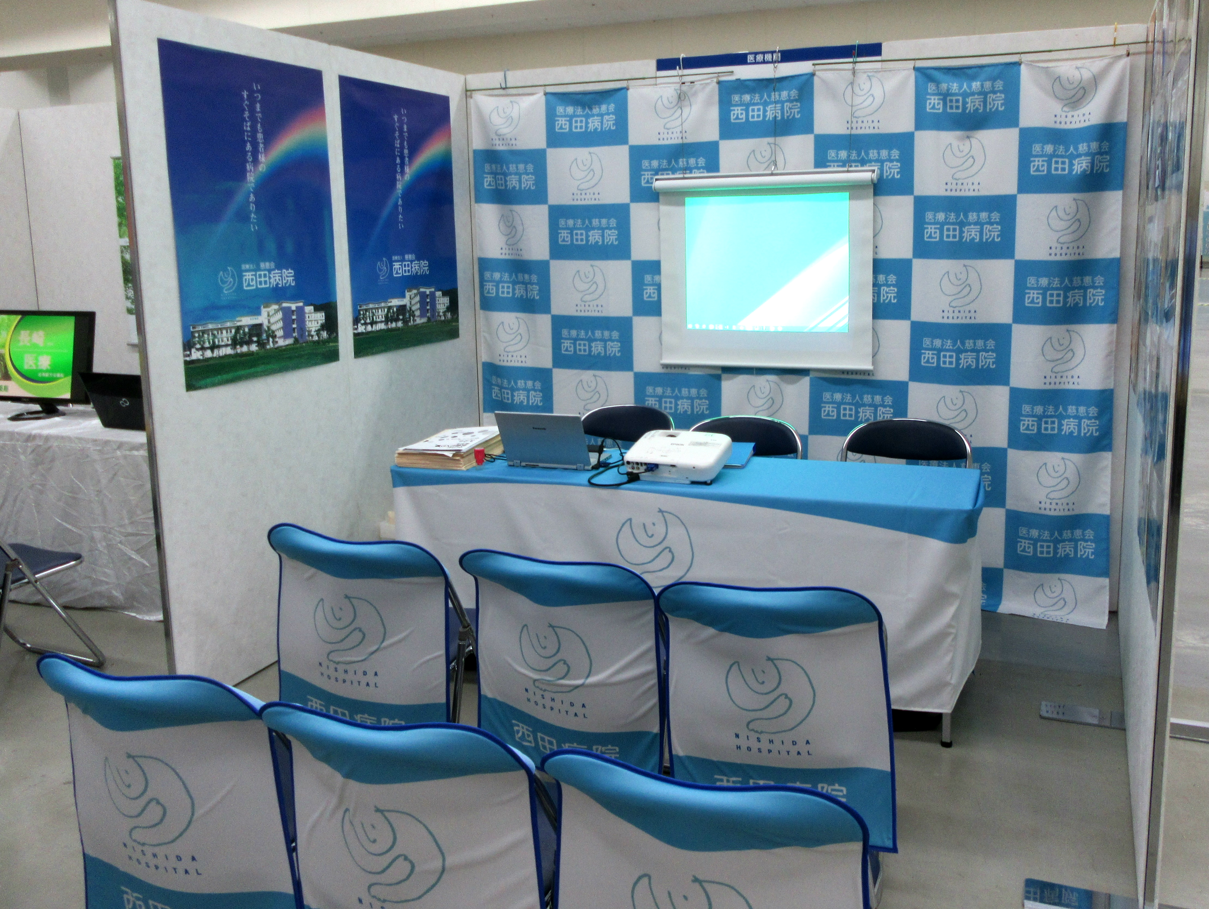 事例380 病院様の説明会ブース装飾用テーブルクロス、椅子カバー、バナースタンドを製作いたしましたお客様製作事例集販促マガジン。