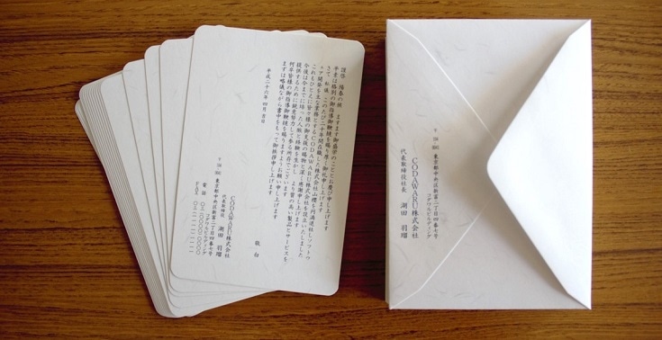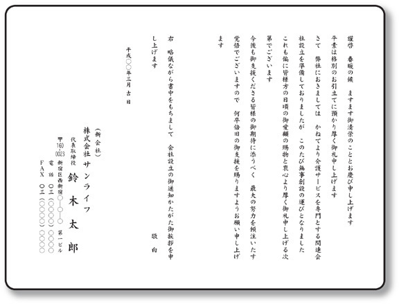 会社設立・独立開業 挨拶状大部数印刷短納期封入封緘投函宛名印刷自由文。