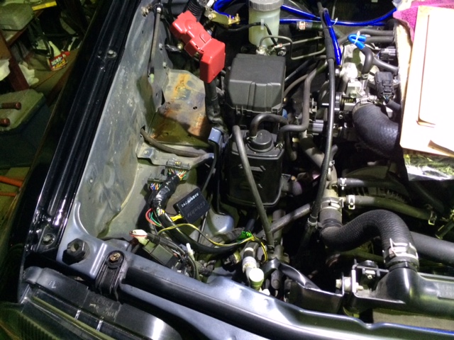 スズキ ジムニー JB23 K6A トラストeマネージ配線加工栃木県栃木市の自動車整備工場 ガレージ北関東 パーツ販売・ワンオフパーツ製作・CPUチューニング・現車セッティングから レースカー製作まで、弊社にお任せ下さい。