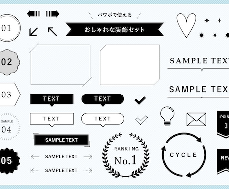 パワポで使えるオシャレな装飾セットを販売いたします 色、線幅、サイズ等、パワポで編集可能なデザインパーツのセットココナラ。