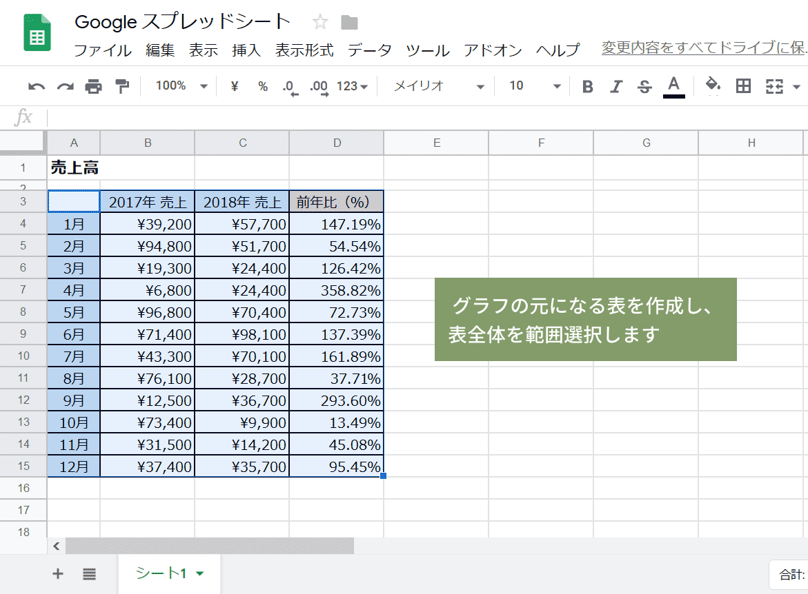 前年同月比の複合グラフの作成方法 図解 スプレッドシートの使い方。