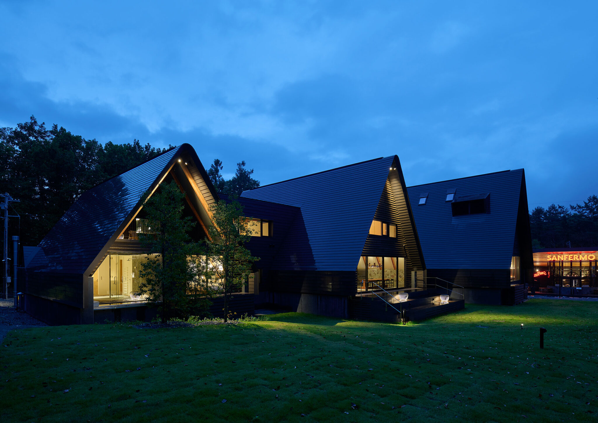 GENETOによる、長野・白馬村の「KANOLLY Resorts」。リゾート開発が進む豪雪地の宿泊施設。地域の山々や風土への敬意と積雪対策を意図し、“合掌造り”を参照した建物を3つ雁行配置して繋げる構成を考案。環境を堪能できるように部屋毎に内外の関係性を調整。