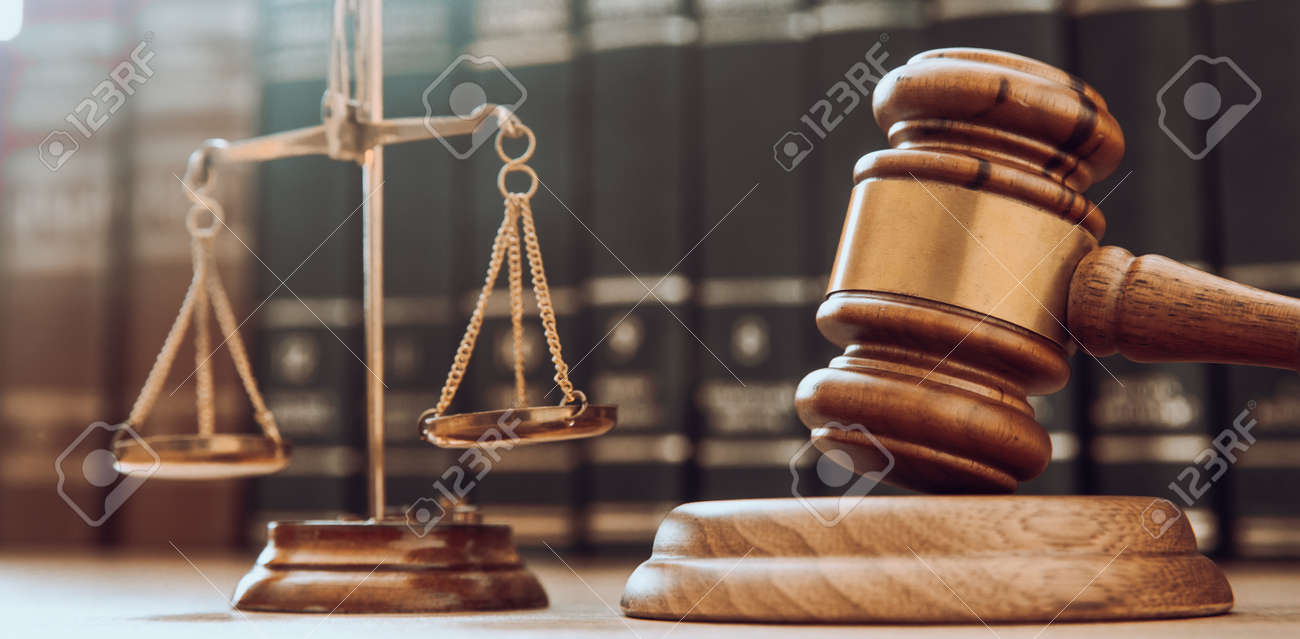 法律テーマ。白い背景の上の裁判官小槌と正義天秤ばかり。3 D イラストレーションの写真素材・画像素材 Image 78999147。