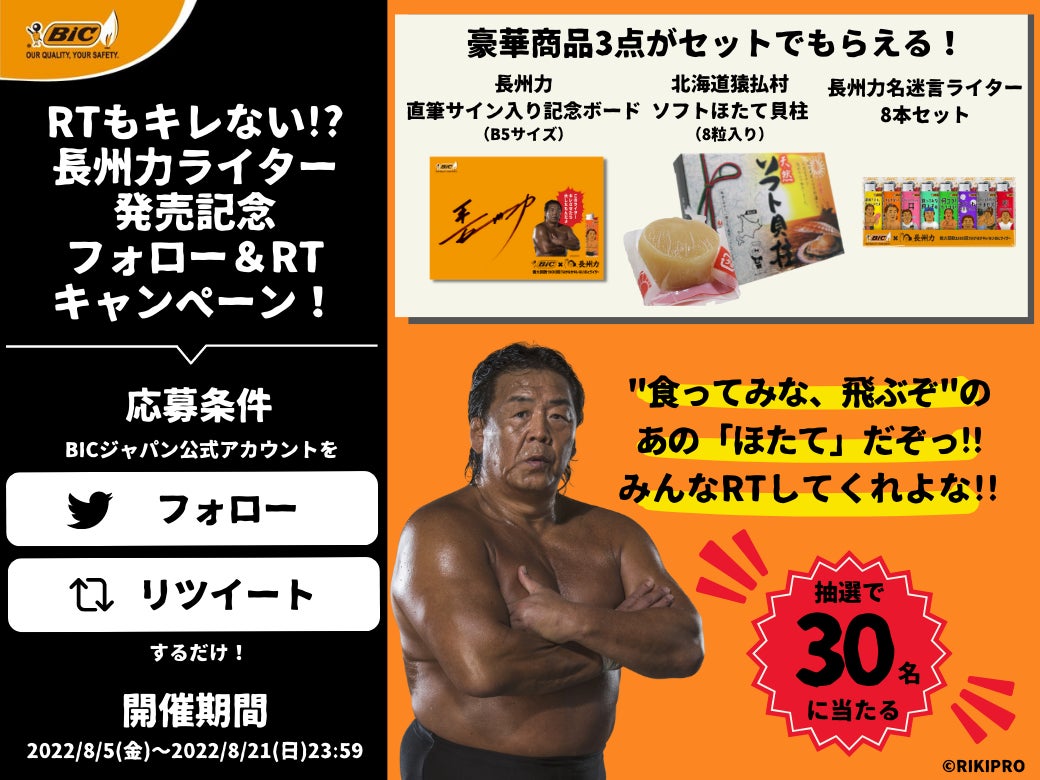 長州力さん直筆サイン入りグッズ含む豪華賞品3点セットが抽選で30名に当たる!「RTもキレない!?長州力ライター発売記念Twitterフォロー&リツイート キャンペーン」、8月5日 金 よりスタート!BICジャパン株式会社のプレスリリース。