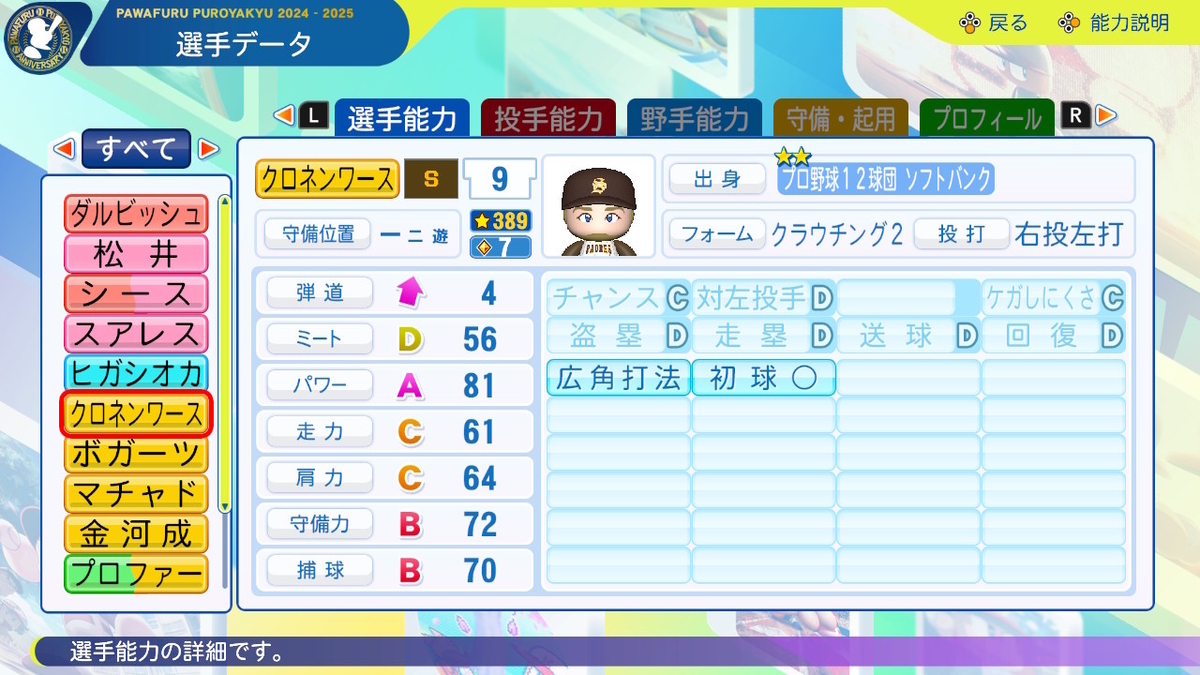 メジャスピ ジェイククロネンワース 2024 の評価とステータスゲームエイト。