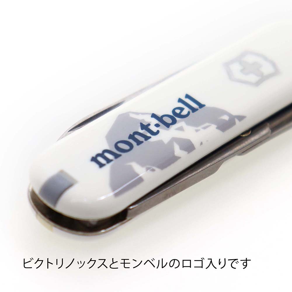ラッピング無料名入れ代込み mont-bell モンベル ビクトリノックス クラシックSD モンベルロゴ ホワイト 名前 名入れ 彫刻 刻印プレゼント ギフト アウトドア キャンプ 登山 釣り お祝い 記念日 誕生日 父の日 記念品 BBQ アーミーナイフ マルチツール 十徳ナイフ。