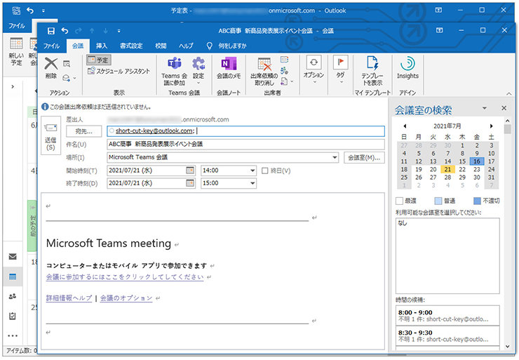 オンライン会議の招待を簡単に送るには Outlook 2021。