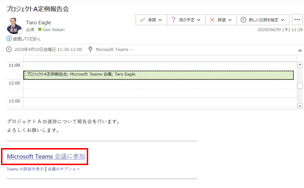 Outlookの「会議出席依頼」を選択すると、Teamsのリンクが貼り付けられる。 - Microsoft Q&A。