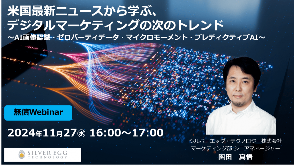 11月27日開催 米国最新ニュースから学ぶ、デジタルマーケティングの次のトレンド~AI画像認識・ゼロパーティデータ・マイクロモーメント・プレディクティブAI~SILVER EGG TECHNOLOGY。