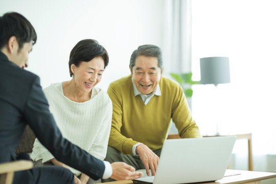 商談する夫婦と店員 28202000018 の写真・イラスト素材アマナイメージズ。