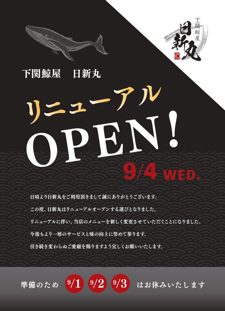 リニューアルオープンに伴う臨時休業のお知らせ下関鯨屋 日新丸。