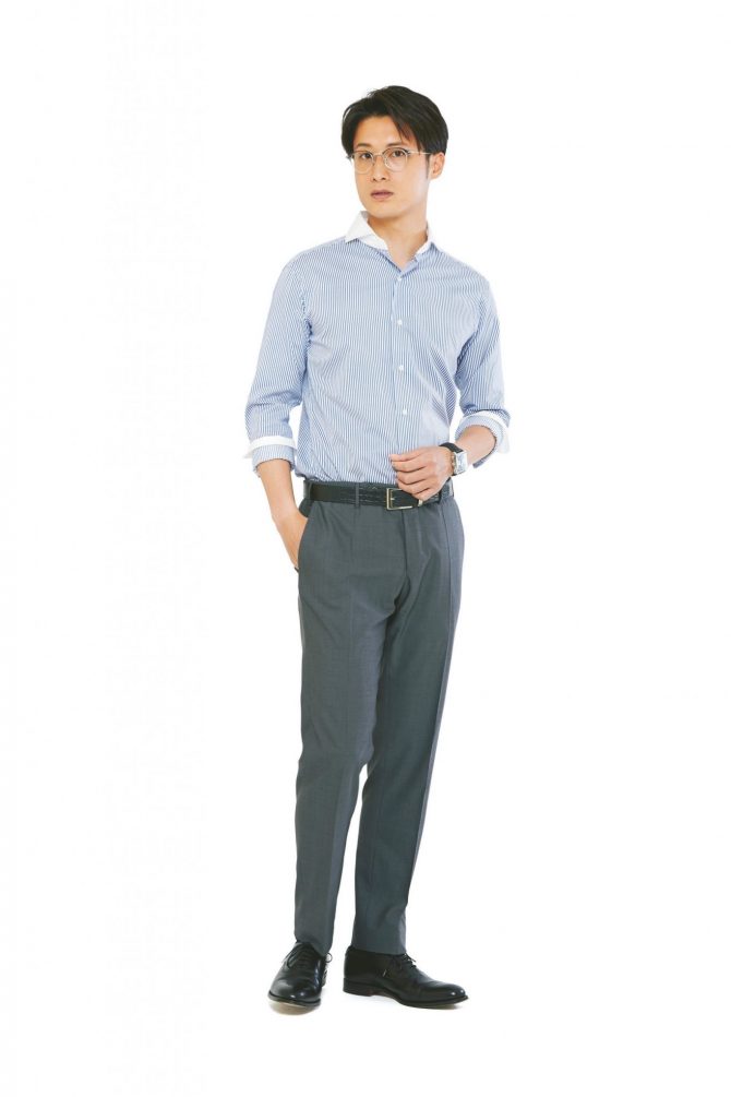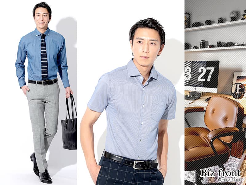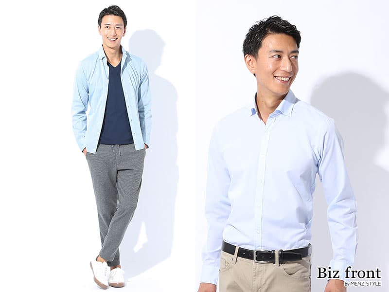 水色シャツメンズコーデはこう着る!ビジネスカジュアル・オフィスカジュアルも爽やかビジネス・オフィス・スマートカジュアル専門通販。