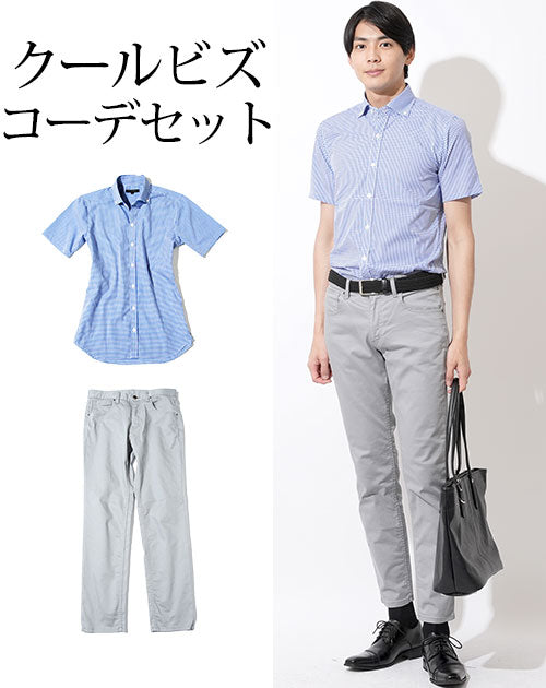 20代メンズクールビズ2点コーデセット ブルーギンガムチェック形態安定半袖シャツ×グレースリムチノパンツ biz。