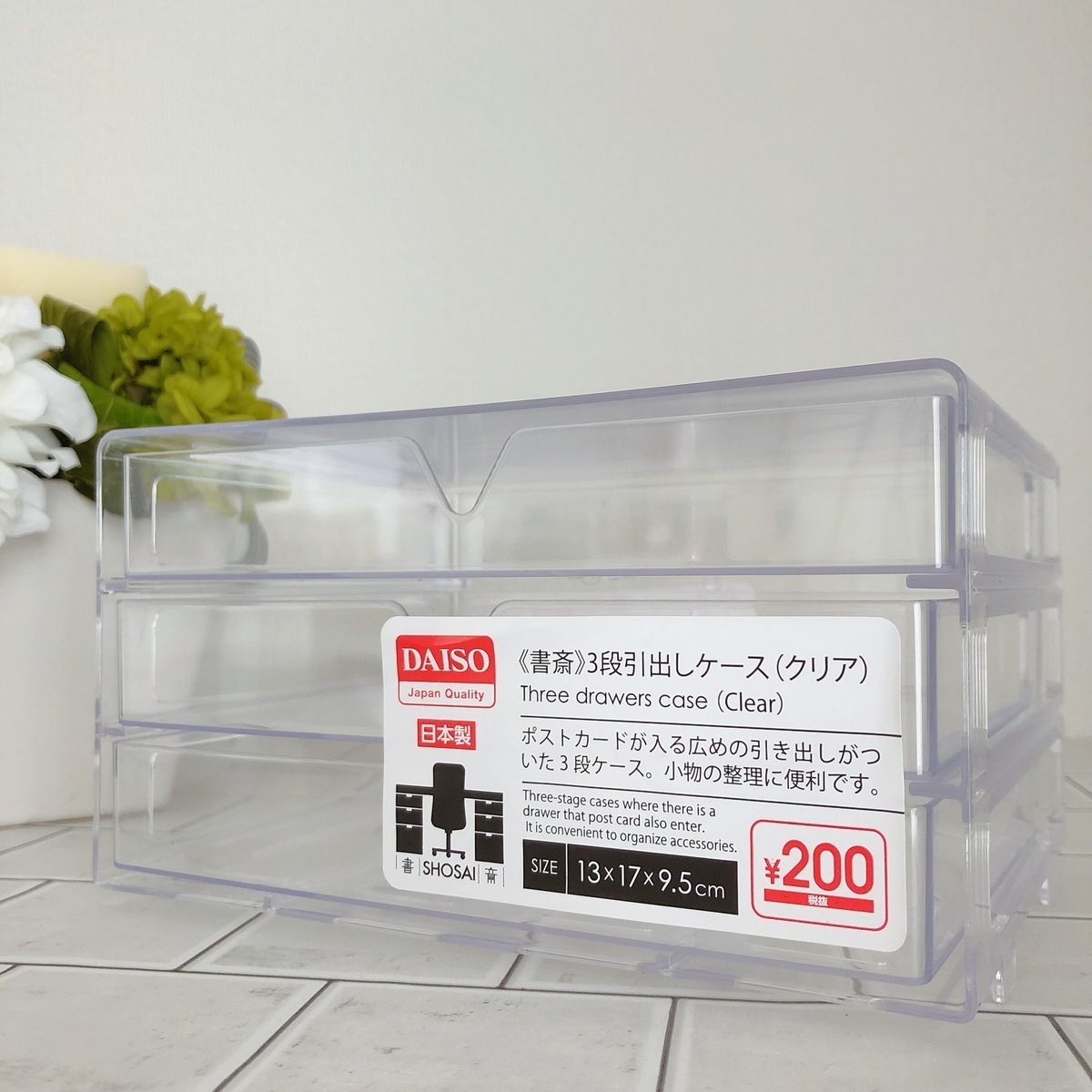 本日はダイソーで購入した 『3段引き出しケース』をご紹介します♡ SNSでも話題になり、私の周りにも 使ってる人多数のクリア収納ケース✨どこも品薄になっていましたが、最近また見るようになってきたので 購入してみました😆✨ まず、コンパクトながら収納量に驚きまし。