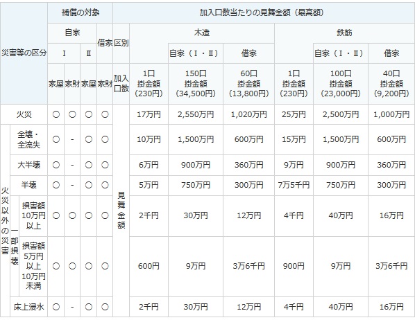 共済金・見舞金の種類と補償額火災共済事業全国都市職員災害共済会。