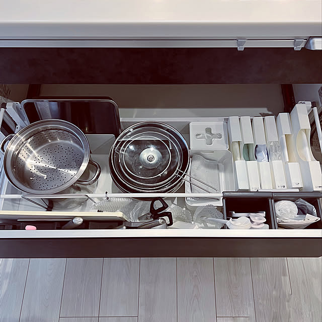 ラクシーナ収納 キッチン側 全部見せ👀 . 特に収納上手とかじゃないんで、大変お恥ずかしいですが😂 こんな感じです❣️ .特別、仕切りボックスとかは多く使わず、ほぼほぼラクシーナに付属してきた仕切りそのまま使ってます🙆♀️ 鍋フライパン収納だけは、立て。