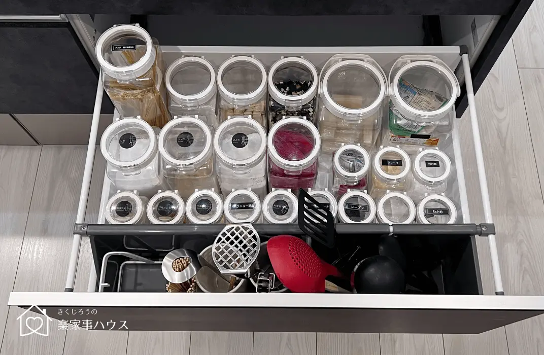 使用アイテム掲載 パナソニックのキッチン『ラクシーナ』前面収納サイズと収納実例写真20枚付き。